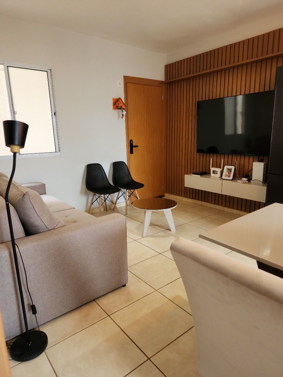 Sala dois ambientes com painel de TV ripado, prateleira e rack suspenso, moderno pendente sobre mesa de jantar.