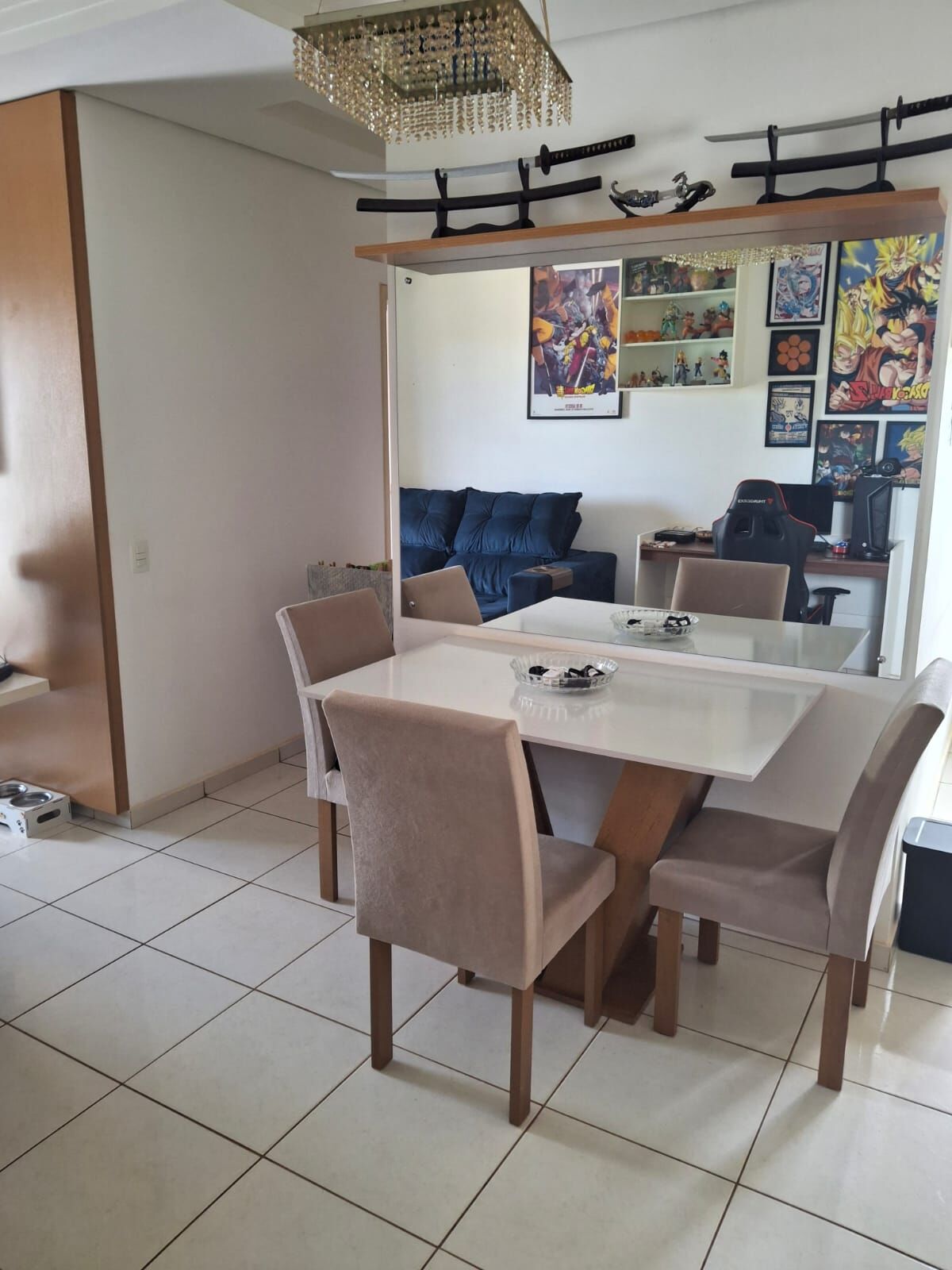 Sala dois ambientes com porta de grande vão permitindo muita luz natural e acesso a varanda gourmet, painel de TV, rack suspenso e cortineiro. No ambiente sala de jantar tem uma generosa espelheira e prateleira decorativa.