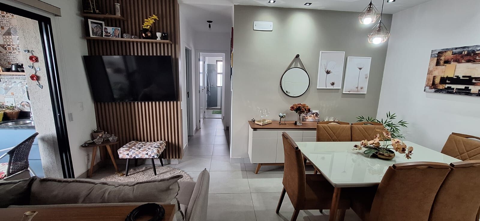 ✅Sala ampla dois ambientes, belos pendentes modelo diamante, porta de grande vão permitindo muita luz natural e acesso a varanda, persiana, painel ripado para TV.