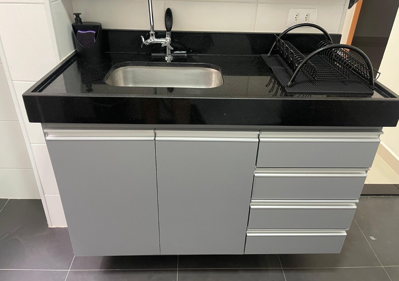 ✅Cozinha com pia e balcão em pedra natural, cooktop e gabinete planejado.