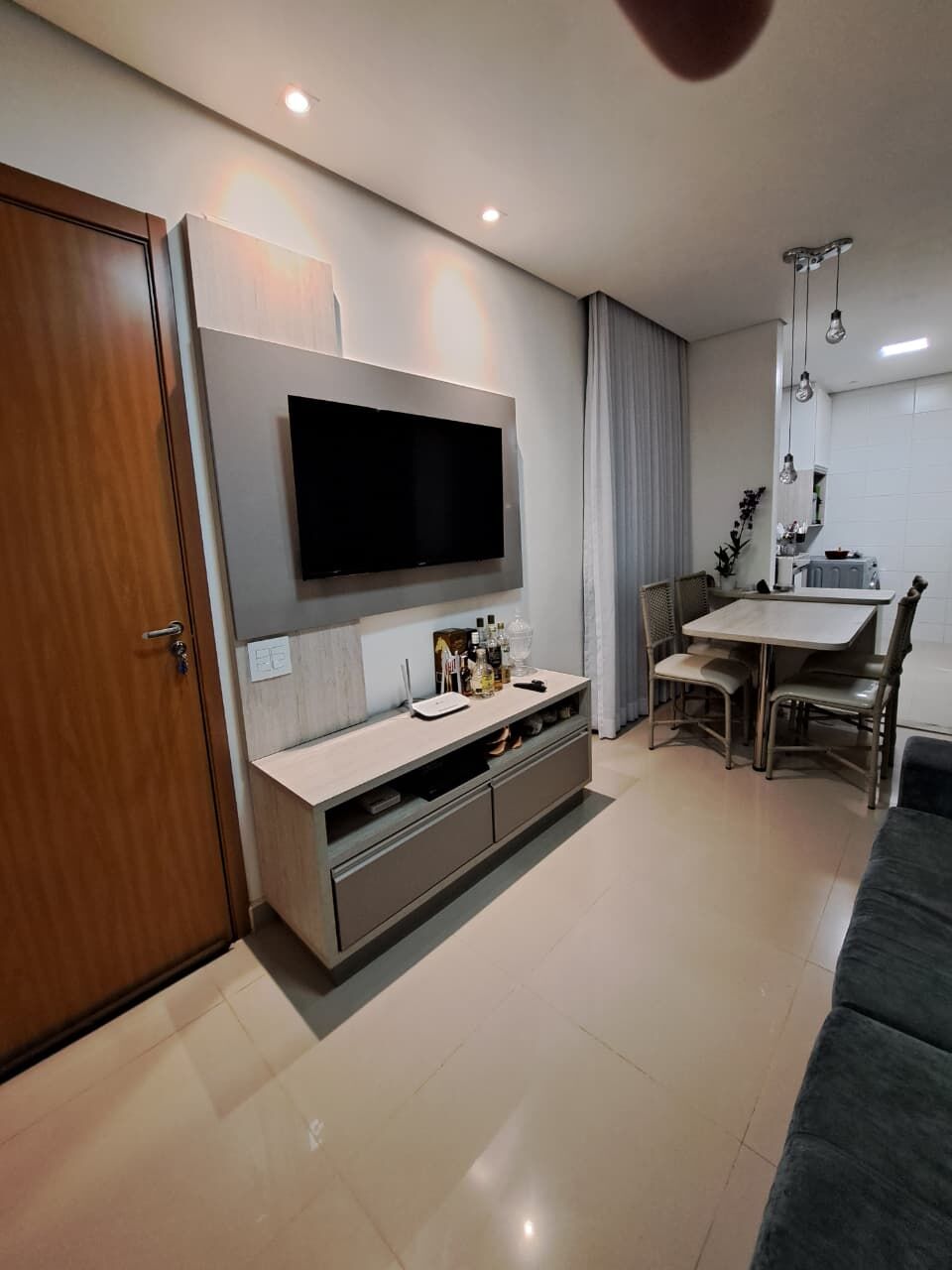 ✅Sala dois ambientes com painel de TV e rack, belo pendente completa a decoração.