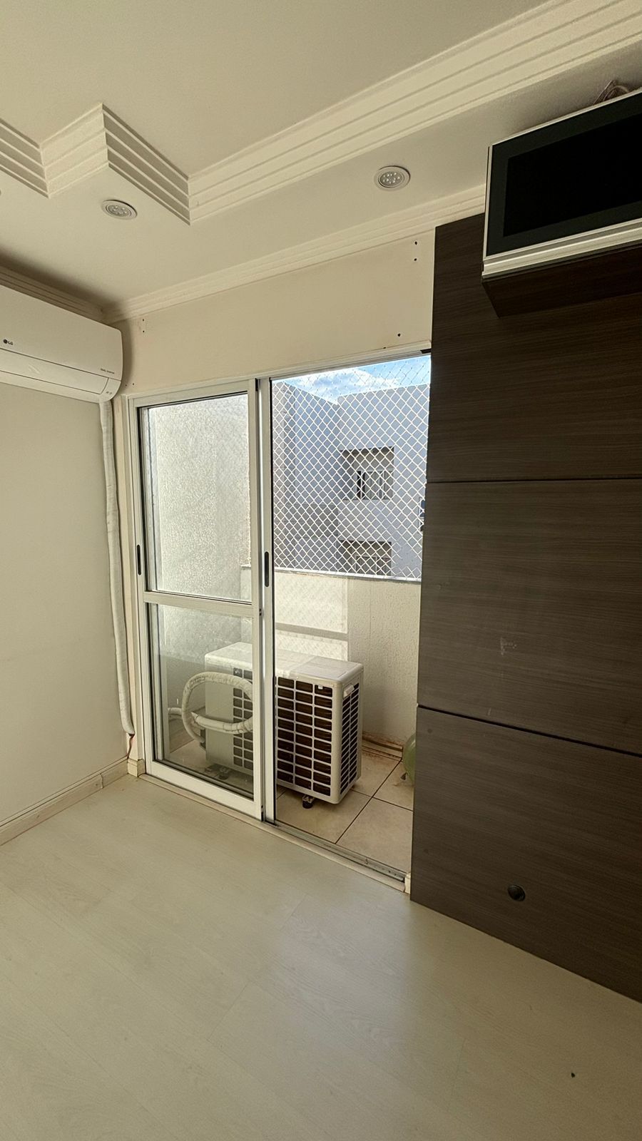 ✅Sala dois ambientes, com sanca de gesso e iluminação de led, painel de TV, ar-condicionado e porta de grande vão com acesso a sacada.