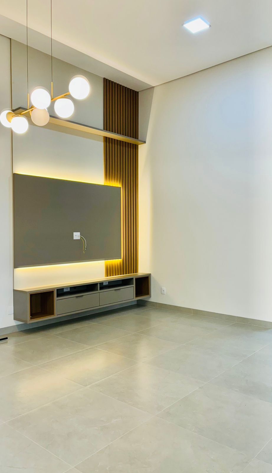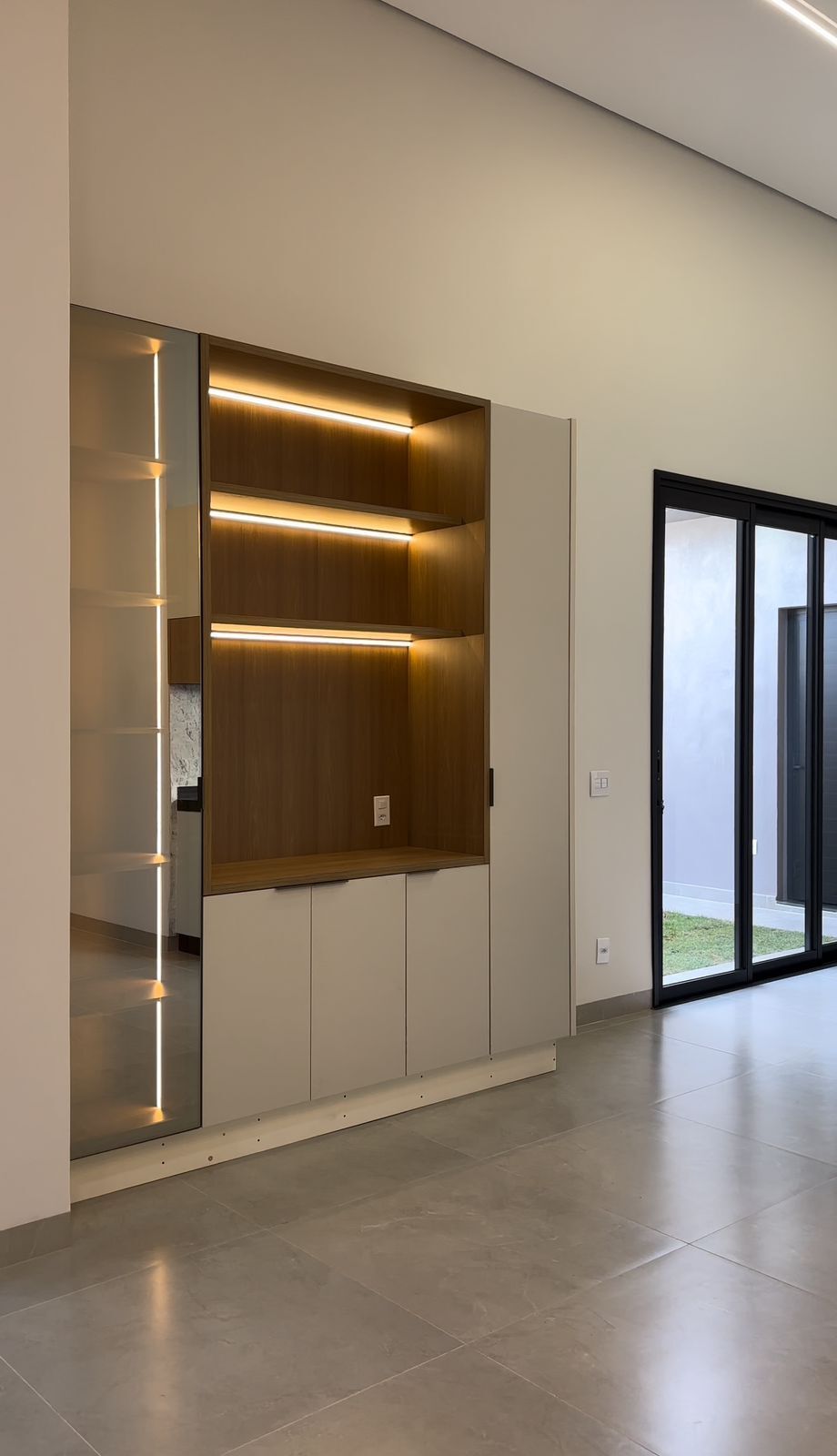 Sala dois ambientes com pé direito alto e pele de vidro, painel de TV e rack suspenso. Esse ambiente conta ainda com linda cristaleira com portas reflecta e LED.