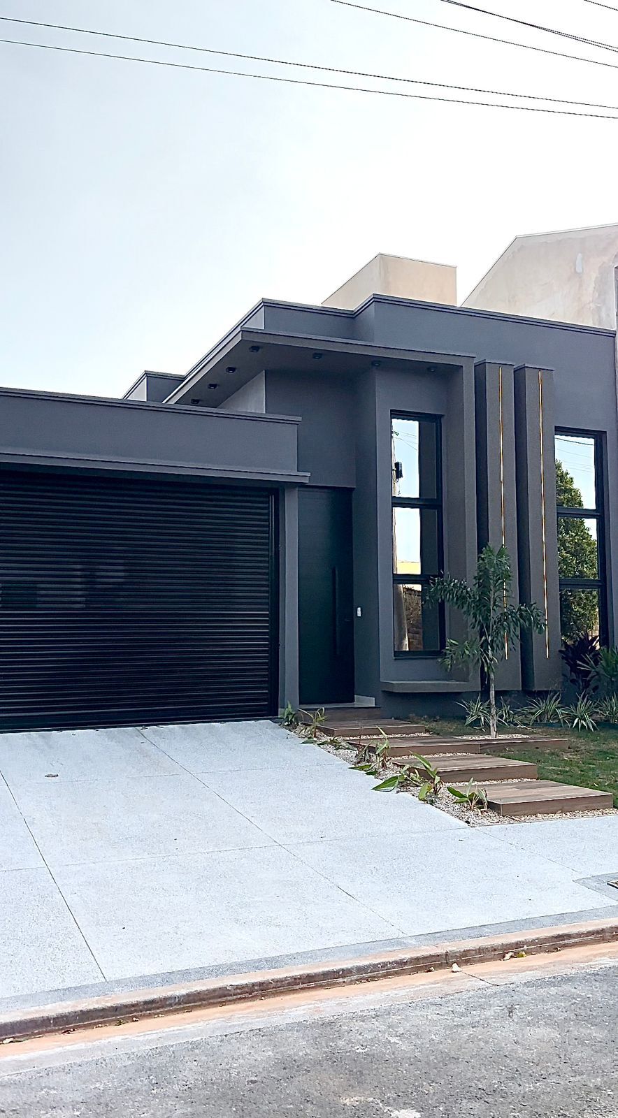 Fachada moderna com volumetria na platibanda.