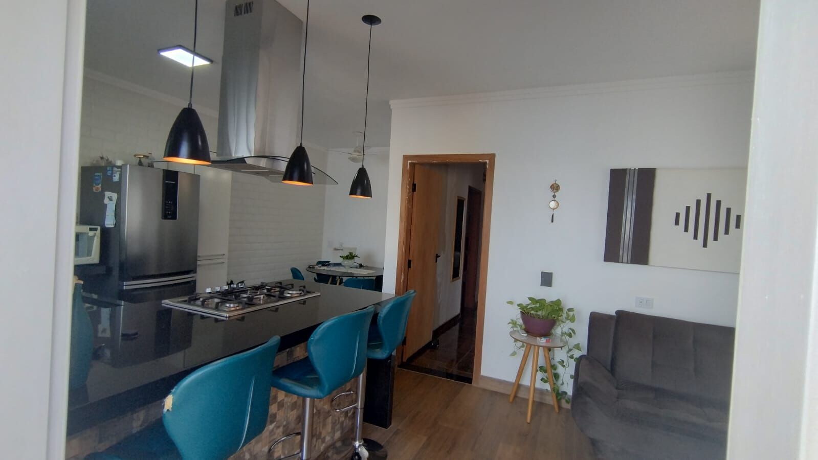 Cozinha americana com pia e península em pedra natural, cuba gourmet, torneira de bica alta monocomando, dispenser de detergente, calha úmida, lixeira de inox embutida, rodabanca em metro withe, cooktop de inox cinco trempes, coifa, torre de tomadas, belos pendentes completam a decoração.