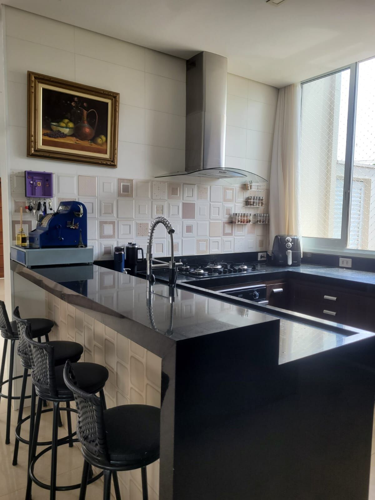✅Cozinha americana com pia e balcão para refeições rápidas em pedra natural, torneira de bica alta monocomando, cooktop de cinco trempres, coifa, forno embutido e completa em armários planejados.