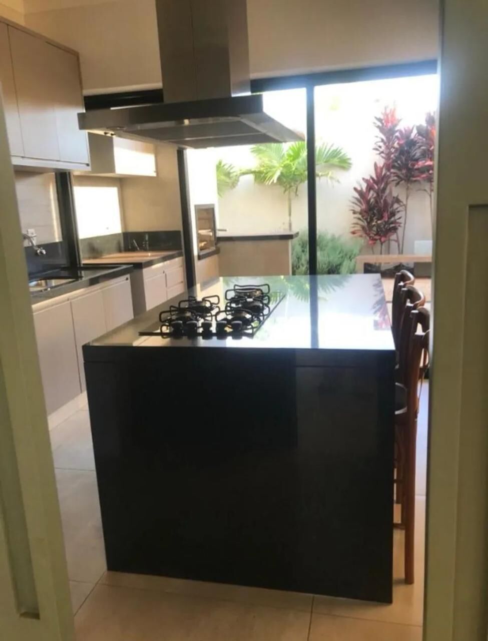 ✅Cozinha americana com pia e ilha em pedra natural, cooktop de cinco trempes, coifa e porta de grande vão permitindo muita luz natural.