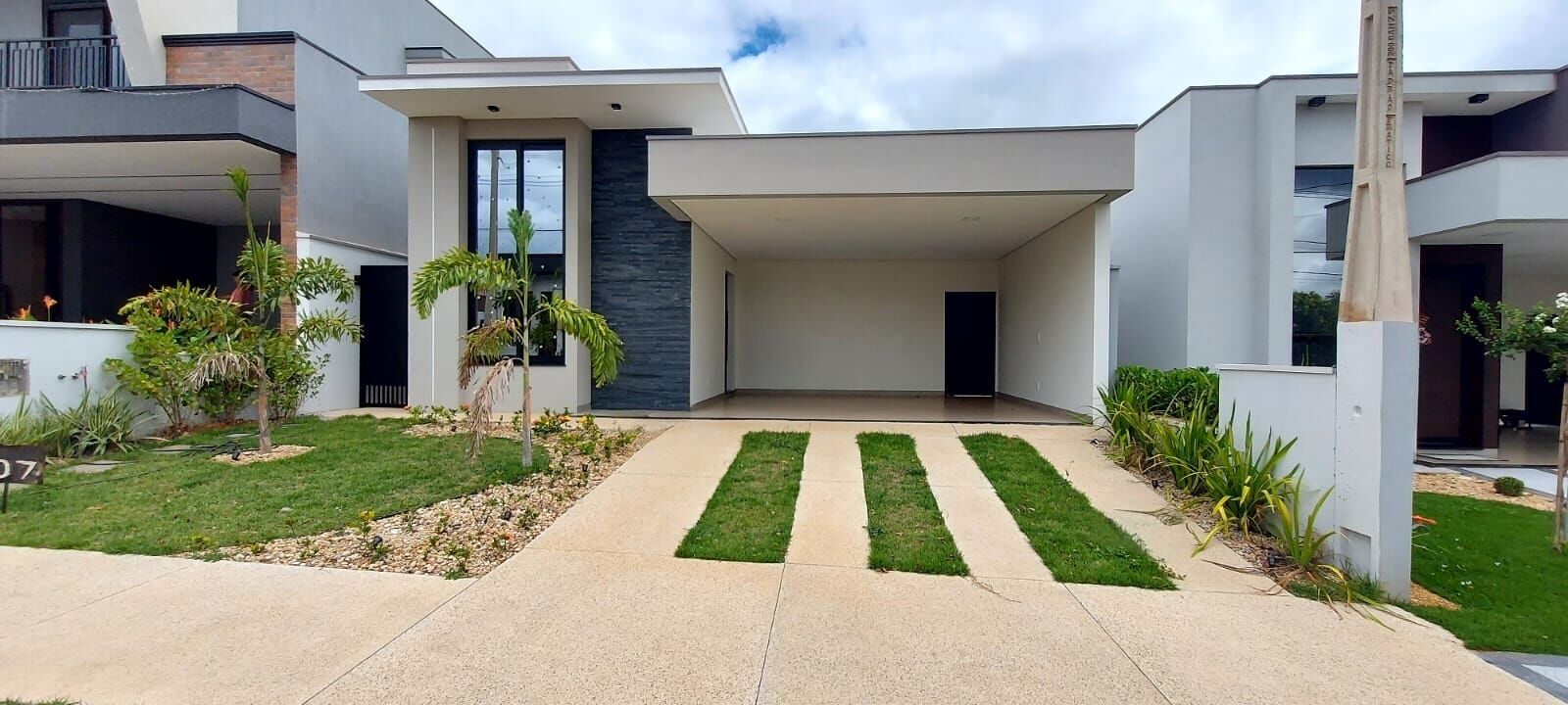 ✨Fachada moderna com volumetria na platibanda, elementos naturais e pele de vidro✨