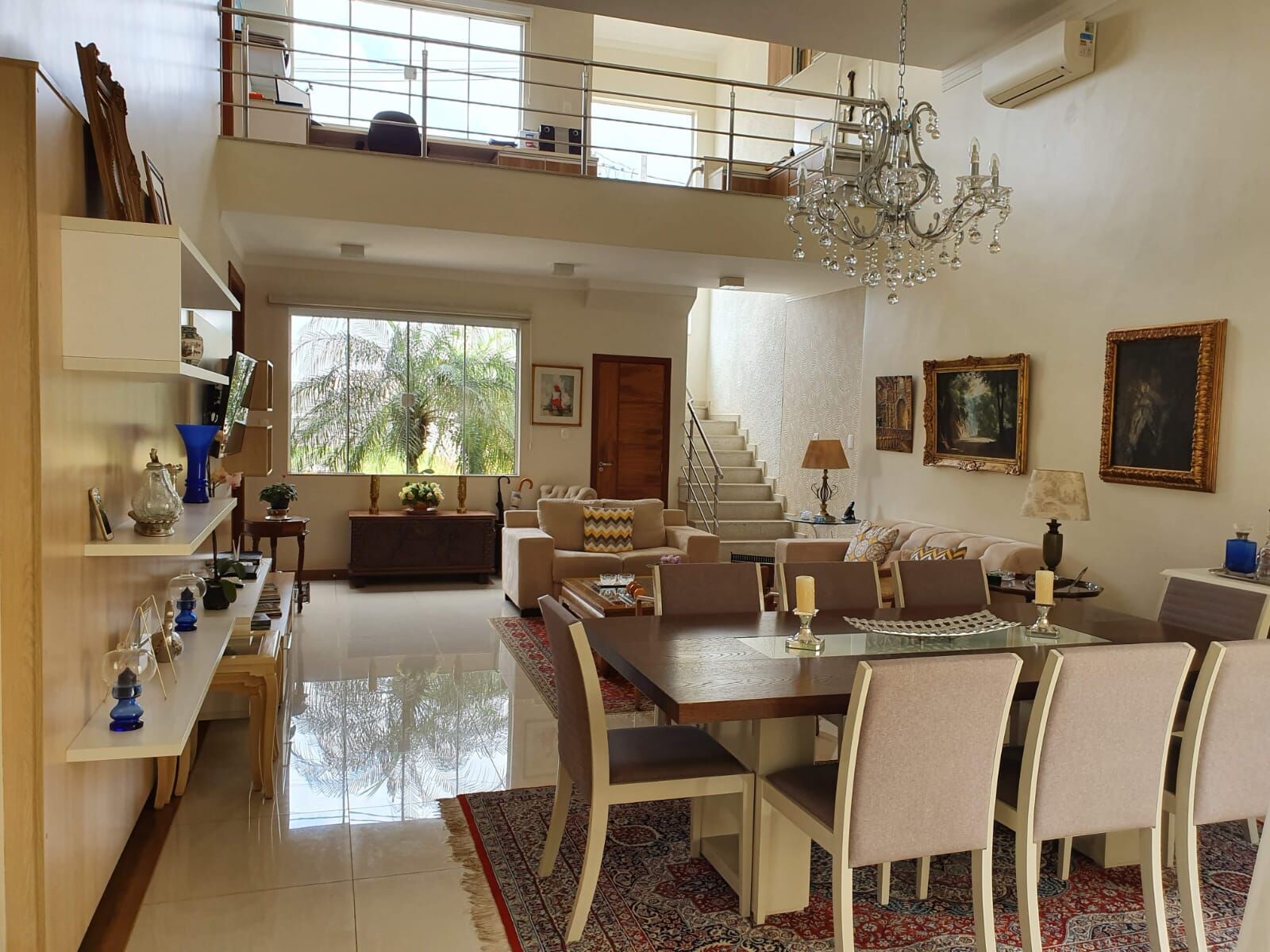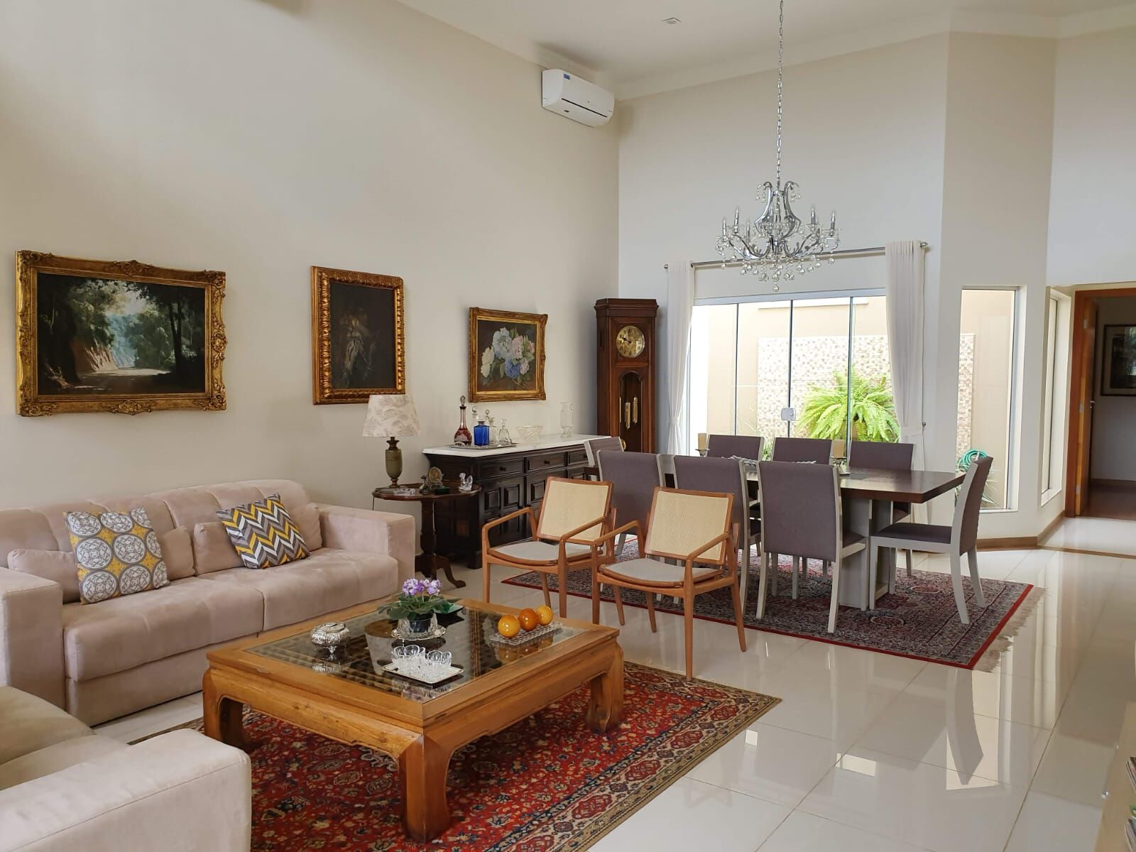 Sala ampla dois ambientes com pé direito alto, porta de vidro de grande vão permitindo muita luz natural, duas máquinas de ar-condicionado, jardim de inverno, cortineiro e belo lustre.
