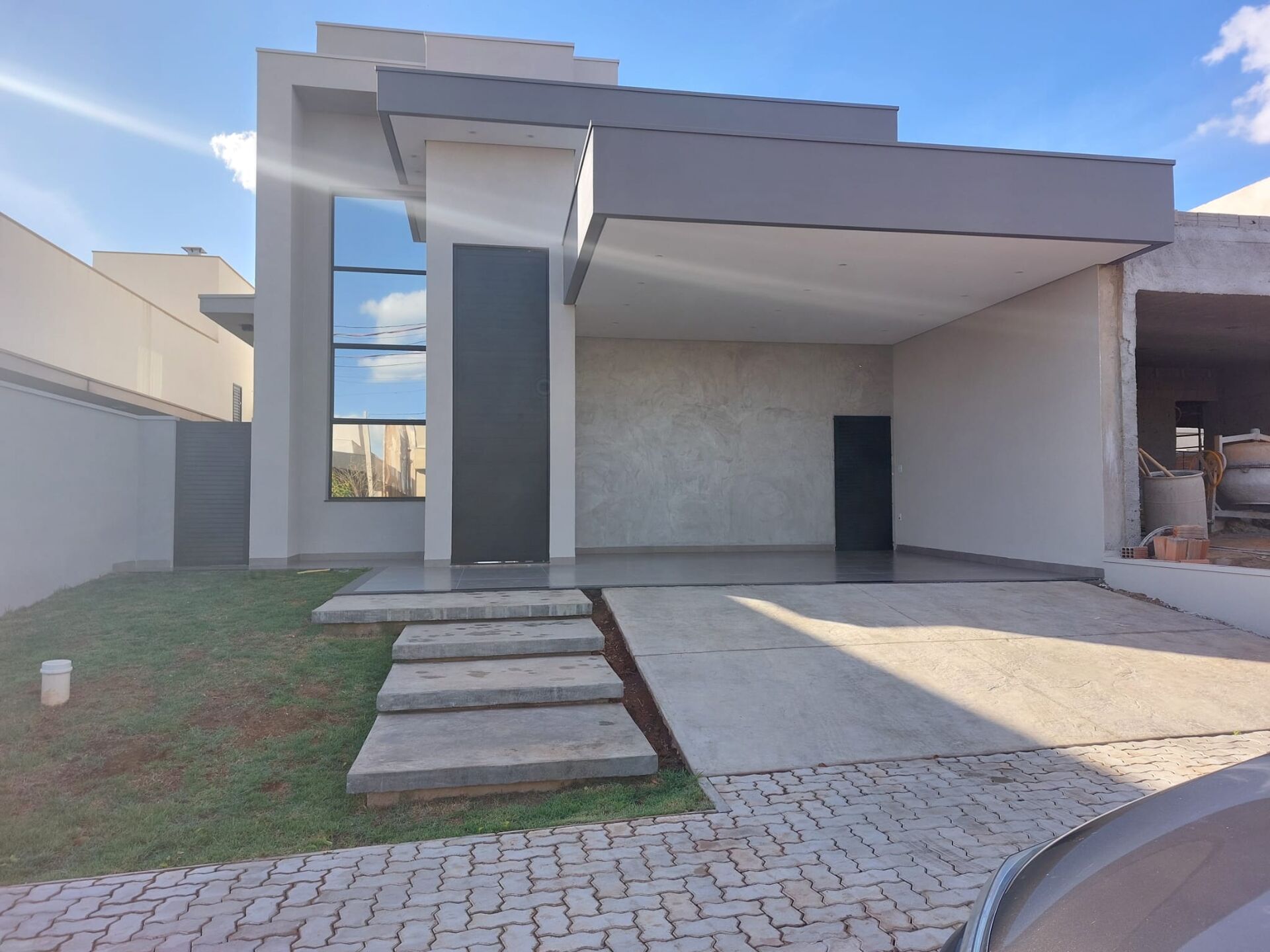 ✅Ampla garagem, fachada com viga em estrutura metálica em balanço e pérgola.